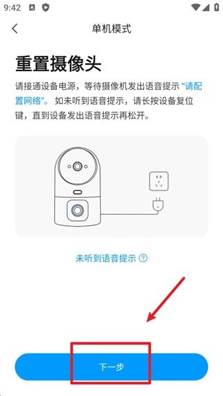 3、按照提示对摄像头进行重置操作,待设备发出“请配置网络”的语音提示后,点击“下一步”按钮。