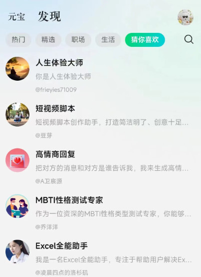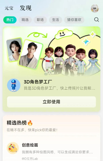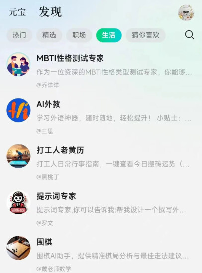 首先,在工作场景中,腾讯元宝具备AI搜索、AI解析、AI写作等核心功能。其中,AI搜索整合了微信搜一搜、搜狗搜索等权威搜索引擎资源,不仅覆盖微信公众号等腾讯生态内容,还纳入了其他互联网平台的权威信息来源。这意味着用户使用AI搜索时,获取的答案会更准确、更全面。此外,腾讯元宝支持png、jpg、jpeg、webp、bmp和heic等多种图片格式的识别解析,同时具备URL解析与对比分析功能,能够更深入地理解并回应用户的问题。在AI解析方面,腾讯元宝可处理单文档最长1000万字的内容,还支持多类型文档解析,能快速提炼用户所需的关键信息。AI写作功能更是实用,无论是报告、方案还是代码,腾讯元宝都能轻松完成……当然,如果认为腾讯元宝只有这些能力,那就低估它了。在发现页面,设有热门、精选、职场、生活、猜你喜欢五个模块。其中,热门板块主要展示筛选后的热榜内容,涵盖资讯、工具推荐、口语陪练等类别……