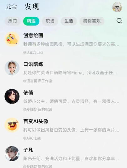 精选内容则更多是一些工具类,包括Aides绘画、口语陪练、AI头像、翻译等……