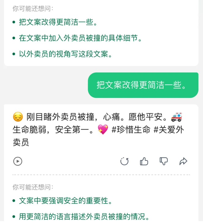 4.要是你觉得苦给出的文案字数太多,和你的风格不搭,只要点击一下你的需求,元宝就会反复修改这段文案。