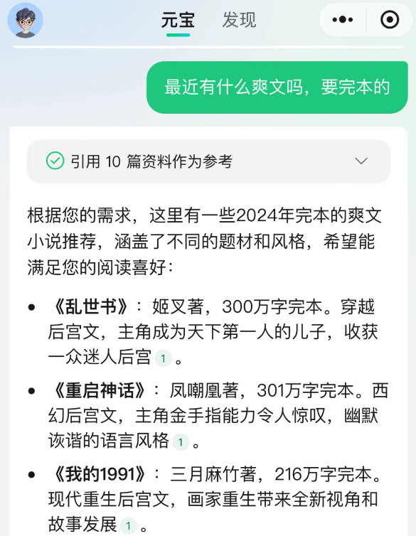 e.网文推荐:无聊时想看些爽文,只管问元宝。