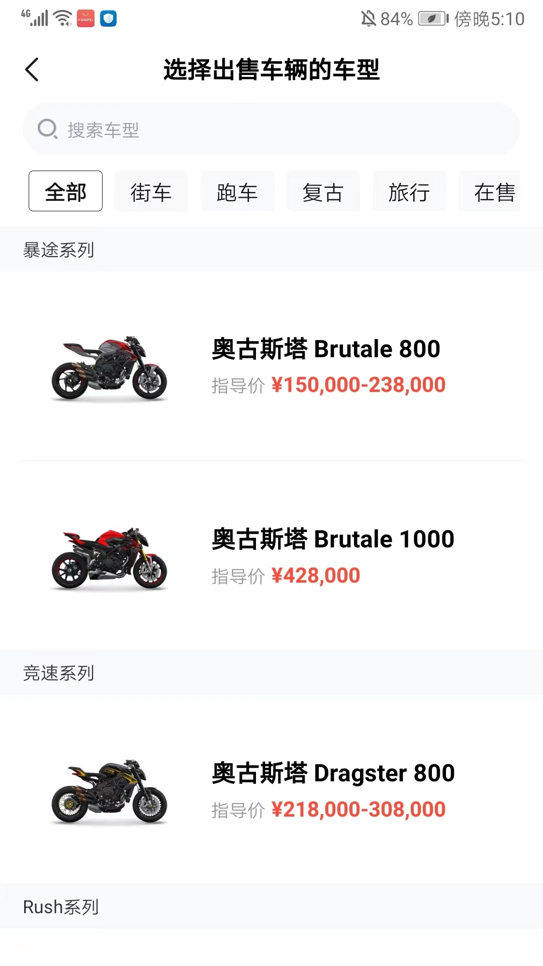 4、挑选要出售的车辆车型,涵盖街车、跑车、复古车、旅行车、在售车型等类别,也能够直接搜索。
