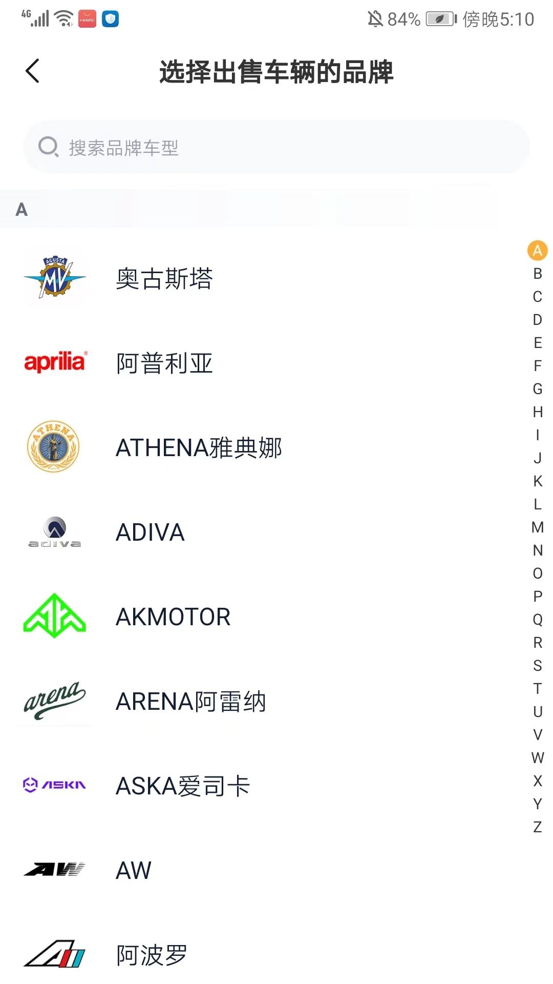 3、滑动屏幕可浏览并选择要出售车辆的品牌,也能通过上方的搜索框搜索对应的品牌。