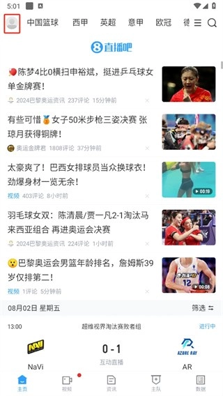 1、第一步是打开直播吧应用,进入首页后能看到最新的体育资讯,接下来要点击左上角的【人像图标】。