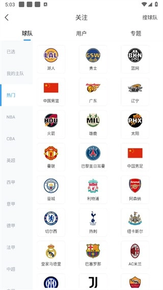 4、最后点击进入关注页面后,选择一个自己想要关注的【球队】并点击,即可完成关注操作。