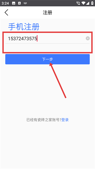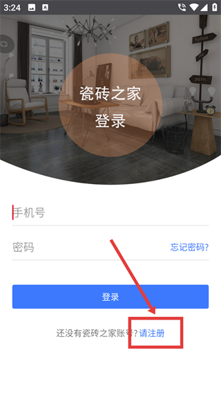 3、在登录界面找到“还没有瓷砖之家账号?请注册”的选项并点击,即可进入手机注册页面。