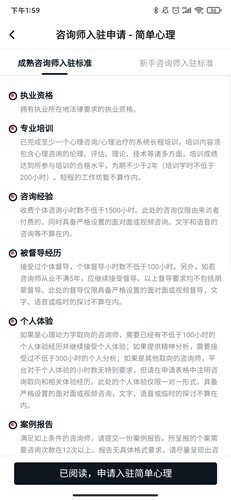软件中的心理医生入驻包含成熟咨询师入驻与新手咨询师入驻两种类型,我们先来说成熟咨询师这一类。