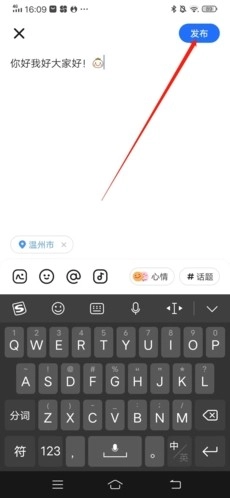 2、在这个界面我们就可以编辑要发布的动态内容了,除了文字之外,还能插入图片和表情,编辑好之后,点击右上角的“发布”按钮就可以了。
