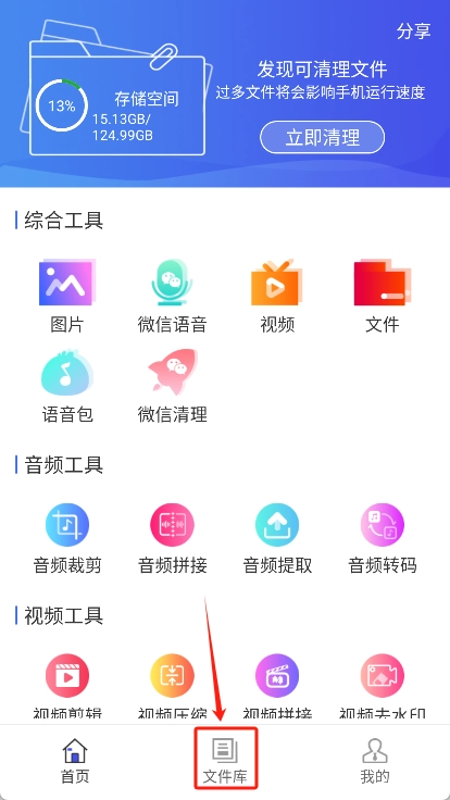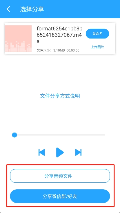 3. 进入语音文件界面后,可选择【分享音频文件】或者【分享至微信群/好友】来完成分享操作。