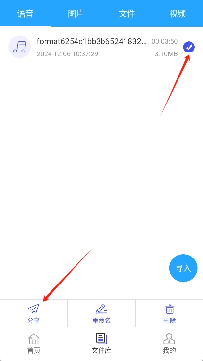 2. 挑选出需要转发的语音文件,在选中文件之后,点击左下方的【分享】按钮。