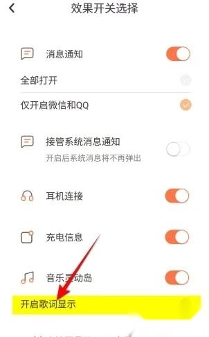 3、点击开启歌词显示功能开关,打开即可。