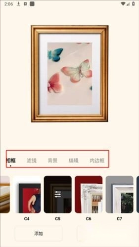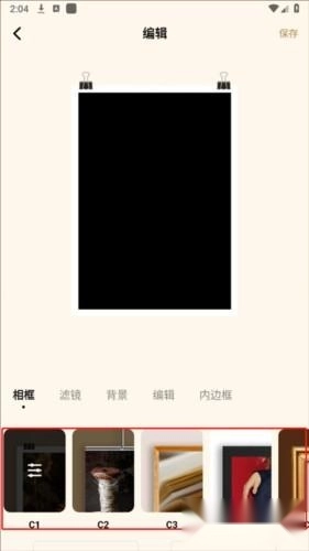 5、这里提供相框、滤镜、背景、编辑、内边框等多种功能供你选择使用,编辑完成后就能直接保存。
