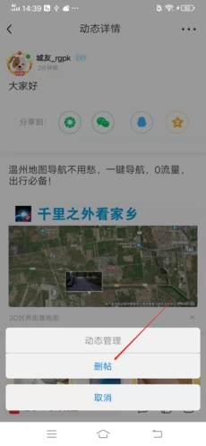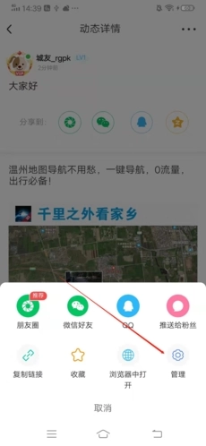 6、选择删除选项:在弹出的菜单选项里找到并点击右下方的【管理】选项,接着点击【删帖】。