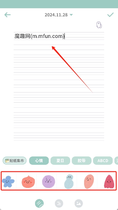 6、可以开始填写日记内容,也可以借助下方的便签记录当下心情的贴纸。