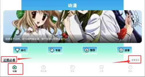 2、借助动漫栏目的近期必看推荐板块,用户可以浏览精选的内容,还能查看完整的推荐列表。