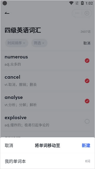 3、选择想要加入单词本的单词勾选中,点击添加至。