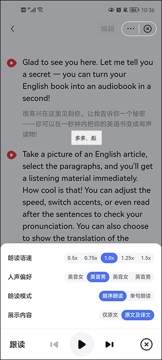 不仅支持美式、英式的男女人声,还能对原文进行翻译等操作。