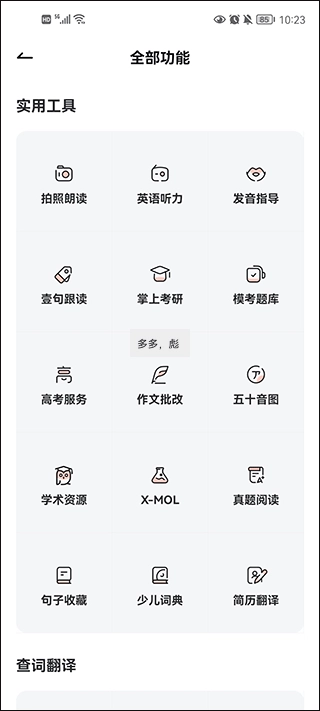1、点击主页的全部功能选项,从中找到你所需的翻译类内容,像拍照翻译、简历翻译、拍照朗读、作业批改、英语听力这类功能都可以。