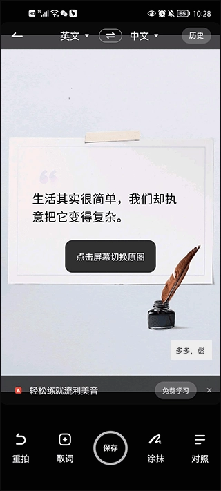 这个功能用起来特别便捷,只需对着文本拍张照,就能直接完成翻译;而且它还具备取词功能,可以把关键单词提取出来,便于大家记录和学习。