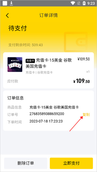 3、还有一种微信支付的方式是这样的:在App里复制好订单ID号,把它发送给客服,就能办理微信支付业务了。