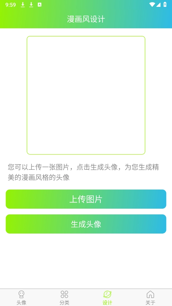 4、点击“设计”选项,仅需上传一张图片,就能生成漫画风格的头像。