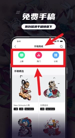 1、手稿商城支持通过“上新”“热门”“分类”三种模式浏览纹身手稿,能全面满足用户对不同风格的检索需求。