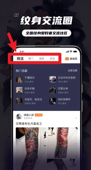 2、纹身交流圈设有精选、热门、实时及关注等多个栏目,用户能够灵活切换栏目,参与话题互动,浏览和分享相关内容。