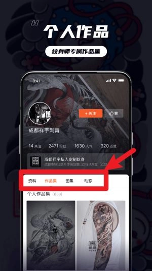 4、个人作品页集中呈现纹身师的详细资料、作品合集、图集及动态,方便用户更深入地了解其风格专长与特色。