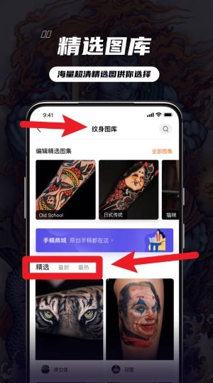 3、精选图库汇聚海量高清纹身设计图稿,支持按精选、最新、最热维度快速筛选,助力用户高效找到心仪图案。