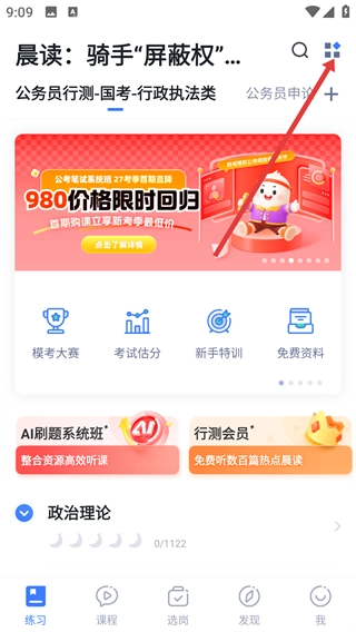 1、在显示【公务员行测-国考-行政执法类】的页面里,点击右上角的图标,就能展开功能选项。