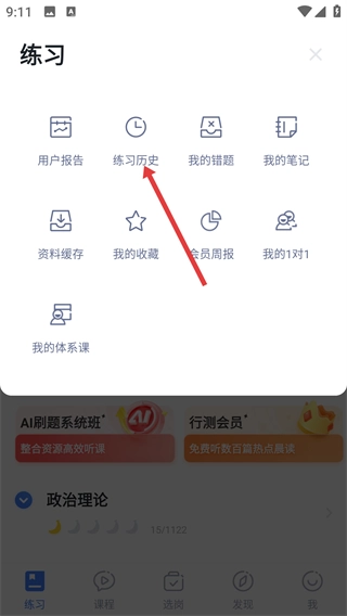 在弹出的【练习】功能菜单中,点击【练习历史】选项,即可进入对应的页面,查看过往的练习相关数据记录。