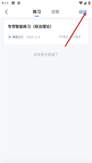 3、进入【练习】页面后,点击右上角的【编辑】按钮,就能进入练习记录的编辑状态,方便对记录开展后续操作。