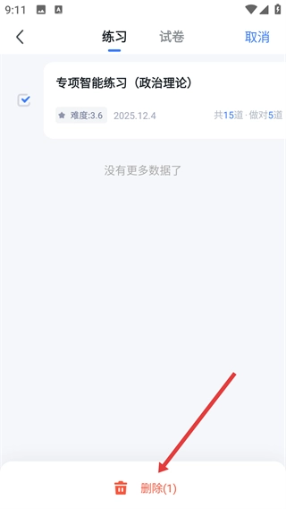 4、处于编辑状态时,选中【专项智能练习(政治理论)】的记录,接着点击底部的【删除(1)】按钮,即可完成这条练习记录的删除操作。