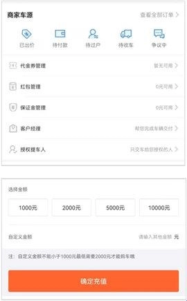 2、接下来需要充值保证金,因为只有完成保证金充值才能参与车辆拍卖。具体操作是:进入“我的”界面,点击“保证金管理”选项,选定要充值的金额后,点击充值按钮即可完成操作。