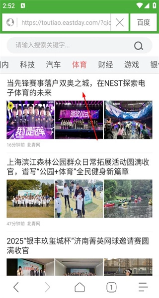 4、挑选体育类别的分类标签,进入体育分类对应的资讯页面,浏览赛事活动以及其他相关的资讯文章内容。