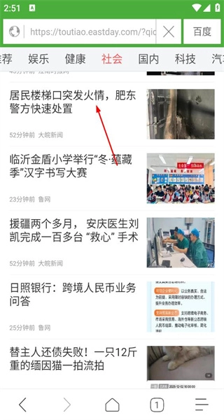 3、点击“社会”分类标签,切换至社会分类的资讯页面,浏览居民火情处置等相关资讯内容。