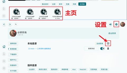2、打开右上角的设置,开启音源数据,利用旁边的“+”图标添加本地音乐文件,添加完成后,主页便会显示这些文件。
