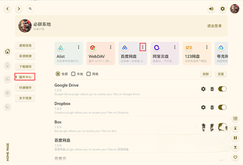 1、在设置中找到“插件中心”,点击网盘右上角的纵向三点标识。