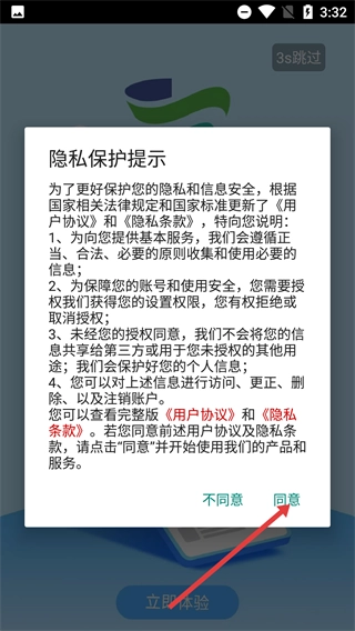 1、当【隐私保护提示】弹窗出现时,请先仔细阅读《用户协议》与《隐私条款》的相关说明,阅读完毕后点击【同意】按钮,即可继续使用本产品的服务。