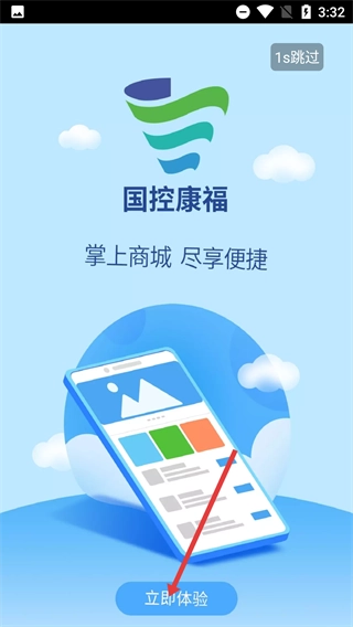 2、在【国控康福】的启动页面,等广告倒计时结束后,点击【立即体验】按钮,即可进入应用的功能界面。