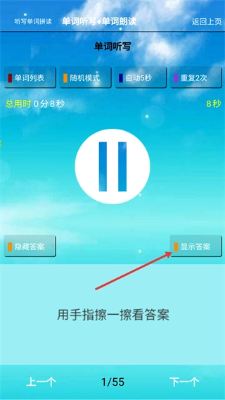 3、练习时要是需要核对内容,点击【显示答案】按钮,就能查看当前单词的拼写、音标和释义。