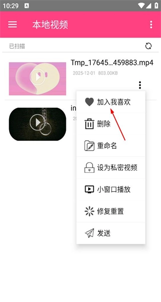 2、点击三点按钮弹出操作菜单,在菜单中选择“加入我喜欢”选项,即可将该视频添加到对应的收藏分类中。