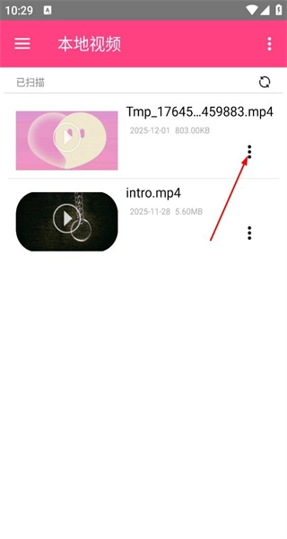 1、启动软件后,进入本地视频界面,查看已扫描出的两个视频,点击第一个视频右侧的三点图标,为后续操作做准备。
