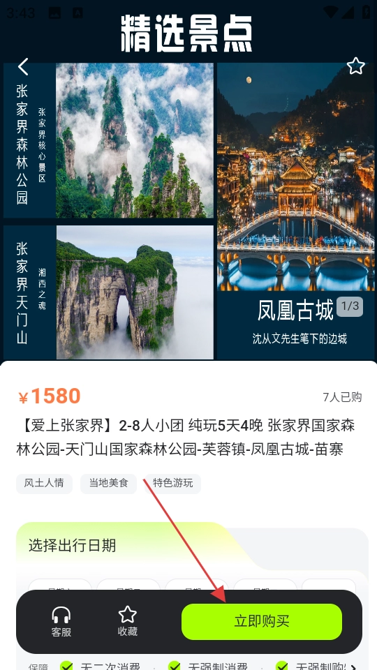 4、进入日期选择页面后,选定合适日期并点击【立即购买】按钮,即可完成该旅游产品的购买流程。