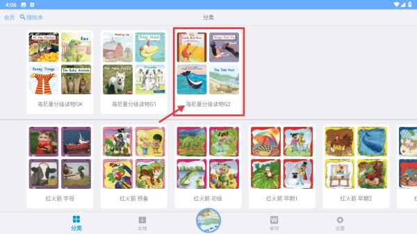 1、打开绘本类应用,在分类页面找到海尼曼分级读物G2的分类选项并点击,进入该分类对应的绘本列表页面。