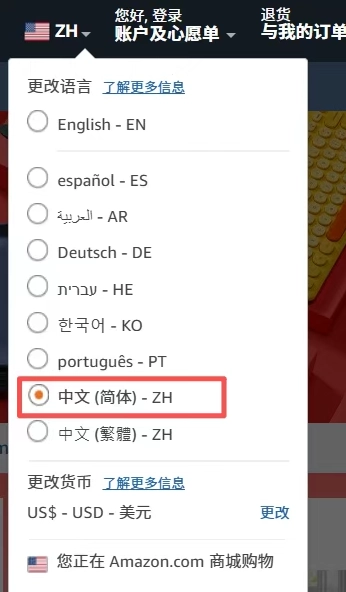 1.在浏览器中搜索“amazon”,切换至国际版,即可打开亚马逊网站;