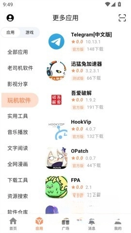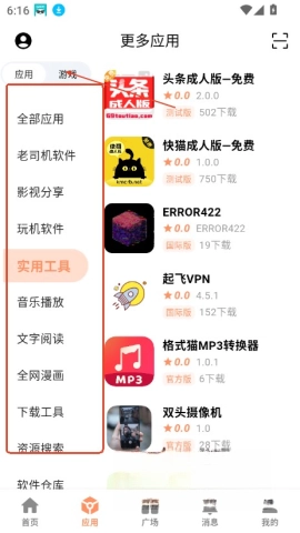 在主界面中,你能看到“应用”“广场”“消息”等多种功能选项,便于你进行浏览与探索。