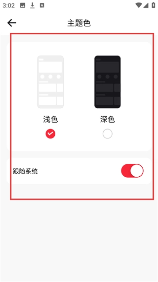 4、在主题色页面,可选择【浅色】-【深色】模式,也可开启【跟随系统】,选后即可切换应用主题风格。