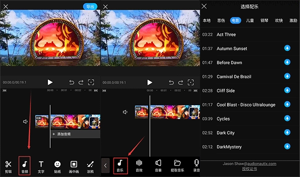 3、在页面底部找到【音频】选项,点击后再选择【音乐】,接着可依据个人需求挑选配乐,此功能支持选择本地音乐。