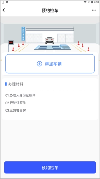 3、输入车辆相关信息,同时需准备好办理人的身份证原件、行驶证原件以及三角警告牌,完成这些后点击预约检车就可以了。